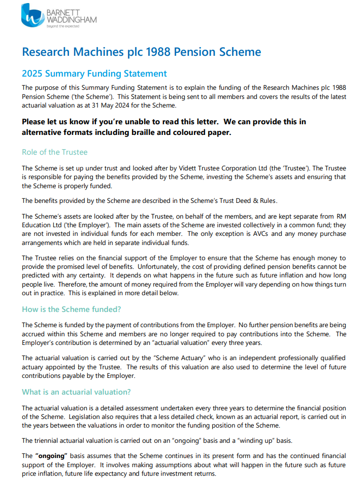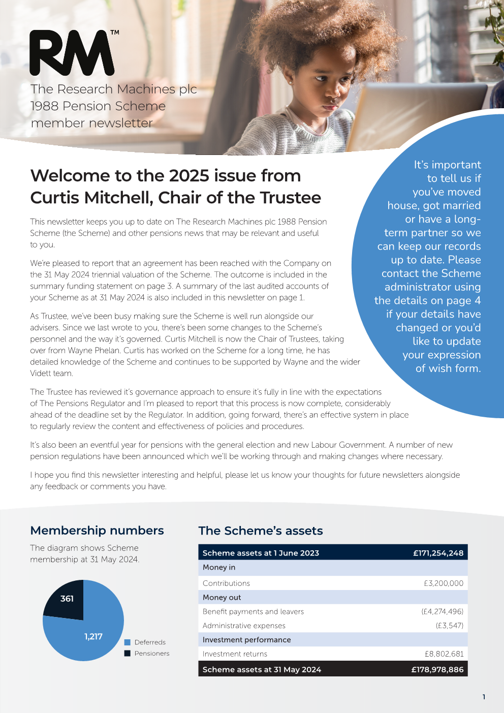This newsletter is from the Trustee of the Research Machines plc 1988 Pension Scheme. It covers the year ending 31 May 2024, highlights important information about the Scheme and updates you on its financial position.